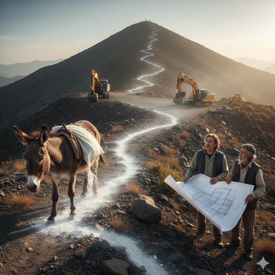 The ambitious construction of a crucial road up a treacherously steep hill had reached a standstill. The supervisor, burdened by the immense pressure of his deadlines,